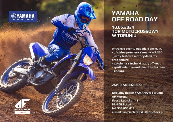 Już 18 maja 2024 roku na toruńskim torze motocrossowym odbędzie się event Yamaha Off-Road Day dedykowany miłośnikom jazdy terenowej. W trakcie imprezy obędzie się prezentacja najnowszej Yamahy WR250F, spotkanie i jazdy pokazowe zawodników AF Motors Yamaha Racing Team, którzy na co dzień ścigają się w Mistrzostwach Polski oraz Mistrzostwach Niemiec ADAC. Przewidziane są dwa panele szkoleniowe z jazdy terenowej. Dodatkowo uczestnicy eventu będą mieli niepowtarzalną możliwość zapisania się i odbycia jazdy testowej motocyklami Yamaha WR250F, YZ250F oraz YZ450.